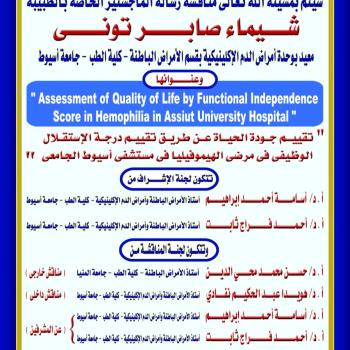 مناقشة رسالة الماجستير للطبيبة / شيماء صابر تونى - معيد بوحدة أمراض الدم الإكلينيكية بقسم الأمراض الباطنة - كلية الطب - جامعة أسيوط