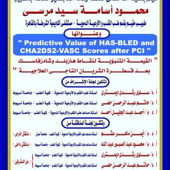 مناقشة رسالة الماجستير للطبيب / محمود أسامة سيد مرسى - طبيب مقيم بقسم طب القلب والأوعية الدموية - مستشفى أكاديمية الشرطة بالقاهرة