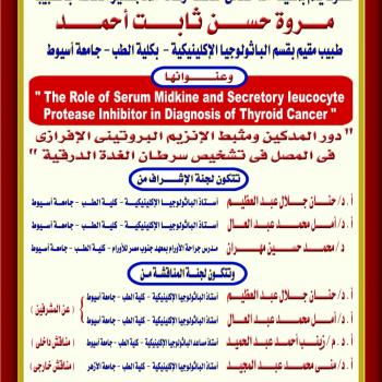 مناقشة رسالة الماجستير للطبيبة / مروة حسن ثابت أحمد - طبيب مقيم بقسم الباثولوجيا الإكلينيكية - كلية الطب - جامعة أسيوط