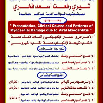 مناقشة رسالة الماجستير للطبيبة / شيرى رفعت أسعد فخرى - طبيب مقيم بقسم طب القلب والأوعية الدموية - كلية الطب - جامعة أسيوط