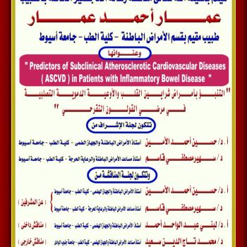مناقشة رسالة الماجستير للطبيب / عمار أحمد عمار - طبيب مقيم بقسم الأمراض الباطنة - كلية الطب - جامعة أسيوط