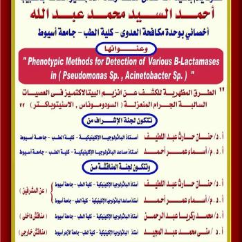 مناقشة رسالة الماجستير الخاصة بالطبيب / أحمد السيد محمد عبد الله - أخصائى بوحدة مكافحة العدوى - كلية الطب - جامعة أسيوط
