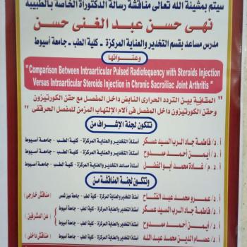 مناقشة رسالة الدكتوراه الخاصة بالطبيبة / نهى حسن عبد الغنى حسن - مدرس مساعد بقسم التخدير والعناية المركزة - كلية الطب - جامعة أسيوط