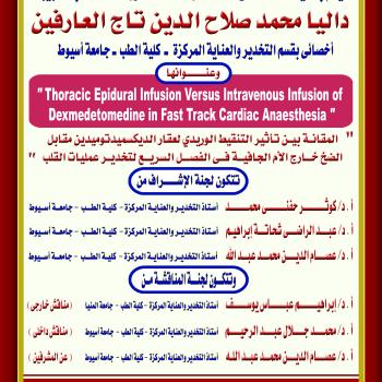 مناقشة رسالة الدكتوراه الخاصة بالطبيبة / داليا محمد صلاح الدين تاج العارفين - أخصائي بقسم التخدير والعناية المركزة - كلية الطب - جامعة أسيوط