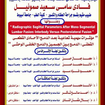 مناقشة رسالة الماجستير الخاصة بالطبيب / فادى سامى سعيد صموئيل - طبيب مقيم بقسم جراحة العظام - كلية الطب - جامعة أسيوط