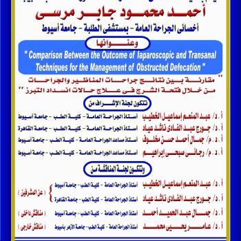 مناقشة رسالة الدكتوراه للطبيب / أحمد محمود جابر مرسى - أخصائى الجراحة العامة بالمستشفى الطلبة - جامعة أسيوط