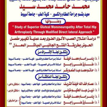 مناقشة رسالة الماجستير الخاصة بالطبيب / محمد حامد محمد سيد - معيد بقسم جراحة العظام – كلية الطب – جامعة أسيوط