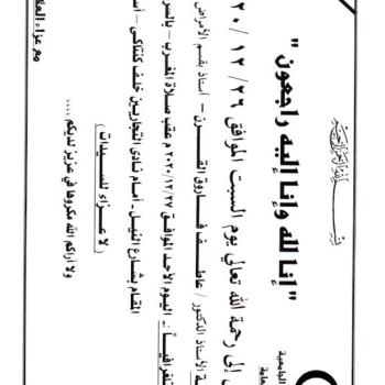 العزاء يوم الأحد الموافق 2020/12/27 م عقب صلاة المغرب بالسرادق المكشوف المقام بشارع النيل أمام نادى…
