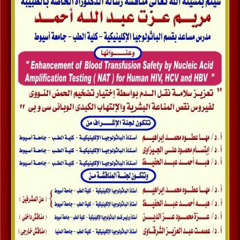 مناقشة رسالة الدكتوراه الخاصة بالطبيبة / مريم عزت عبد الله أحمد - مدرس مساعد بقسم الباثولوجيا الإكلينيكية - كلية الطب - جامعة أسيوط