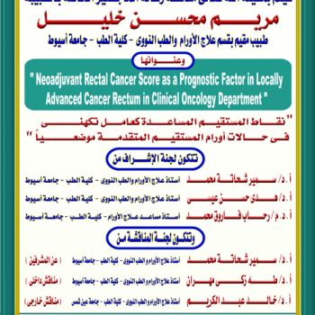 سيتم بمشيئة الله تعالي مناقشة رسالة الماجستير الخاصة بالطبيبة مريم محسن خليل طبيب مقيم بقسم علاج الاورام والطب النووي كلية الطب جامعة اسيوط
