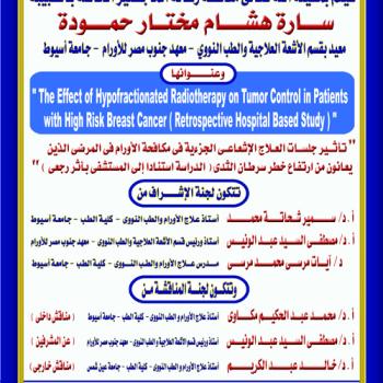 سيتم بمشيئة الله تعالي مناقشة رسالة الماجستير الخاصة بالطبيبه ساره هشام مختار حمودة معيدة بقسم الاشعه العلاجية والطب النووي معهد جنوب مصر للاورام جامعة اسيوط