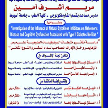 سيتم بمشيئة الله تعالي مناقشة رسالة الدكتوراه الخاصة بالصيدلانية مريم أشرف أمين مدرس مساعد بقسم الفارماكولوجي كلية الطب جامعة اسيوط