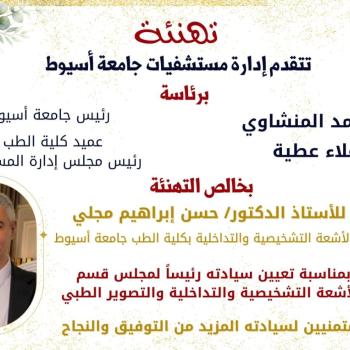 تهنئة الأستاذ الدكتور حسن إبراهيم مجلي لتعيين سيادته رئيساً لمجلس قسم الأشعة التشخيصية و …