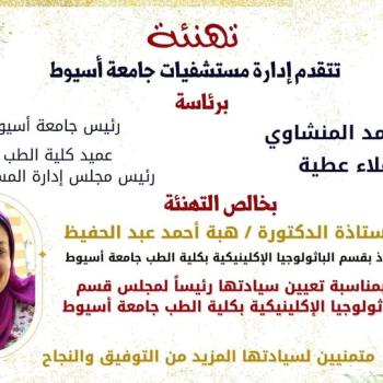 تهنئة السيدة الأستاذ الدكتورة هبه أحمد عبد الحفيظ لتعيين سيادتها رئيساً لقسم الباثولوجيا…