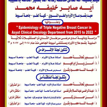 مناقشة رسالة الماجستير الخاصة بالطبيبة / آية صابر خليفة محمد - معيد بقسم علاج الأورام والطب النووي - كلية الطب - جامعة أسيوط