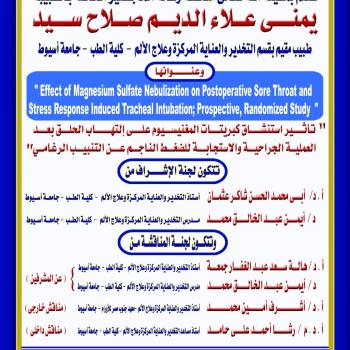 مناقشة رسالة الماجستير الخاصة بالطبيب / أحمد جمال إسماعيل عبد الحافظ - طبيب مقيم بقسم التخدير والعناية المركزة وعلاج الألم - كلية الطب - جامعة أسيوط