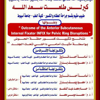 مناقشة رسالة الماجستير الخاصة بالطبيب / كيرلس طلعت سعد الله - طبيب مقيم بقسم جراحة العظام والكسور - كلية الطب - جامعة أسيوط
