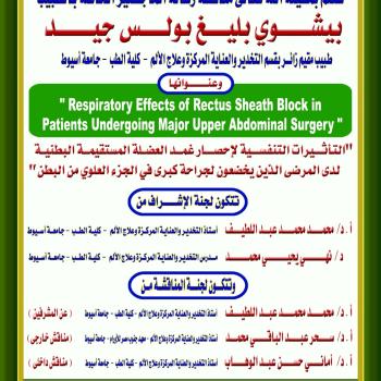 مناقشة رسالة الماجستير الخاصة بالطبيب / بيشوي بليغ بولس جيد - طبيب مقيم زائر بقسم التخدير والعناية المركزة وعلاج الألم - كلية الطب - جامعة أسيوط