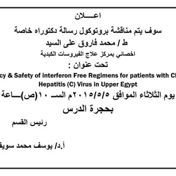 سوف يتم مناقشة بروتوكول رسالة دكتوراه خاصة ط / محمد فاروق على السيد اخصائي بمركز علاج الفيروسات الكبدية