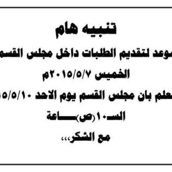 الاجتماع العلمي الأسبوعي للقسم بقاعة الدرس بالدور السادس يوم الاثنين الساعـــــــــ10 ـــــــــة وذلك بتاريخ 4/5/2015 م