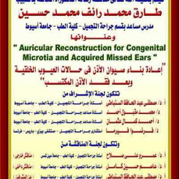 سيتم بمشئة الله تعالي مناقشة رسالة الدكتوراه الخاصة بالطبيب / طارق محمد رائف محمد حسين بقسم جراحة التجميل