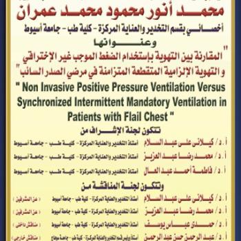سيتم بمشئة الله تعالي مناقشة رسالة الدكتور الخاصة بالطبيب محمد انور محمود محمد عمران اخصائي بقسم التخدير والعناية المركزة