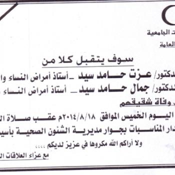 سوف يتقبل كلا من الاستاذ الدكتور / عزت حامد سيد والاستاذ الدكتور / جمال حامد سيد العزاء في وفاة شقيقهم