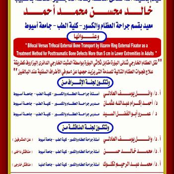 مناقشة رسالة الماجستير الخاصة بالطبيب / خالد محسن محمد أحمد - معيد بقسم جراحة العظام و الكسور - كلية الطب - جامعة أسيوط