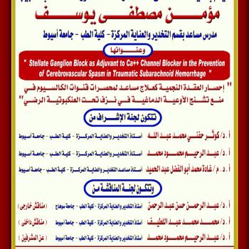 مناقشة رسالة الدكتوراه الخاصة بالطبيب / مؤمن مصطفي يوسف - مدرس مساعد بقسم التخدير والعناية المركزة - كلية الطب - جامعة أسيوط