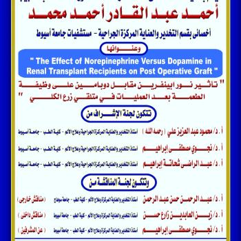 مناقشة رسالة الدكتوراه الخاصة بالطبيب / أحمد عبد القادر أحمد محمد - أخصائى بقسم التخدير والعناية المركزة الجراحية - مستشفيات جامعة أسيوط