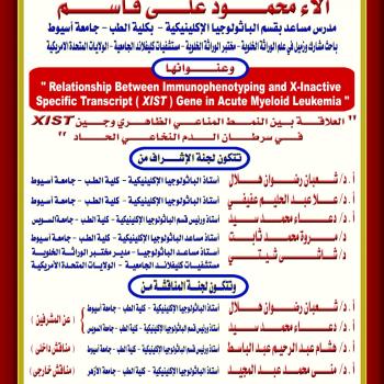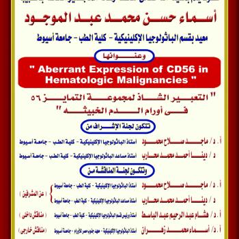 مناقشة رسالة الماجستير الخاصة بالطبيبة / أسماء حسن محمد عبد الموجود - معيد بقسم الباثولوجيا الإكلينيكية - كلية الطب - جامعة أسيوط