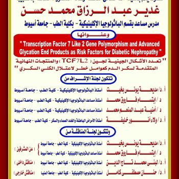مناقشة رسالة الدكتوراه الخاصة بالطبيبة / غدير عبد الرزاق محمد حسن - مدرس مساعد بقسم الباثولوجيا الإكلينيكية - كلية الطب - جامعة أسيوط