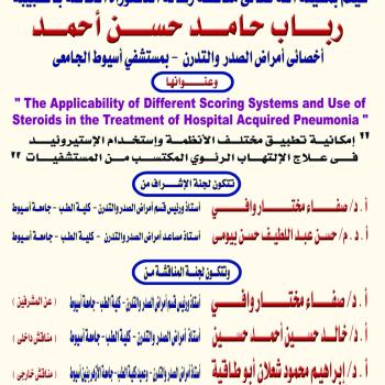 مناقشة رسالة الدكتوراه الخاصة بالطبيبة / رباب حامد حسن أحمد - أخصائى أمراض الصدر والتدرن - كلية الطب - بالمستشفي الجامعى الرئيسي