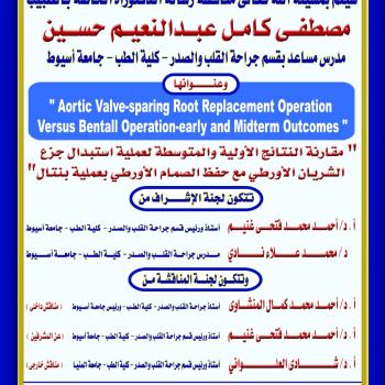 مناقشة رسالة الدكتوراه الخاصة بالطبيب / مصطفى كامل عبد النعيم حسين - مدرس مساعد بقسم جراحة القلب والصدر - كلية الطب - جامعة أسيوط