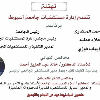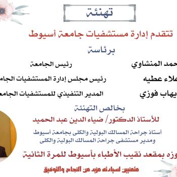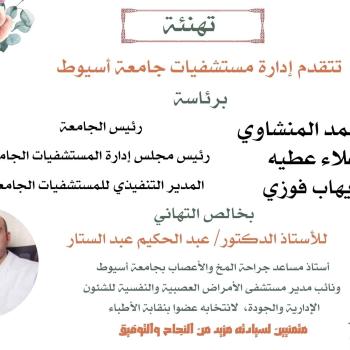 مستشفيات جامعة أسيوط تهنئ الأستاذ الدكتور / عبد الحكيم عبد الستار لانتخابة عضوا بنقابة أطباء أسيوط