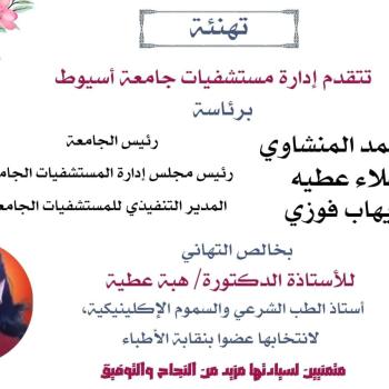 مستشفيات جامعة أسيوط تهنئ الأستاذ الدكتورة / هبه عطية لانتخابها عضوا بنقابة أطباء أسيوط