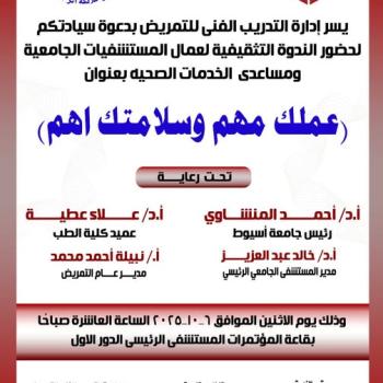 غدا.. "عملك مهم وسلامتك أهم" في ندوة تثقيفية لمساعدي الخدمات الصحية بمستشفيات جامعة أسيوط المصدر:…