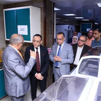 الأستاذ الدكتور علاء عطية عميد كلية الطب ورئيس مجلس إدارة المستشفيات الجامعية يستقبل الأستاذ الدكتور جمال بدر نائب رئيس الجامعة لشئون الدراسات العليا والبحوث أثناء زيارته لمعامل الباثولوجيا الإكلينيكية