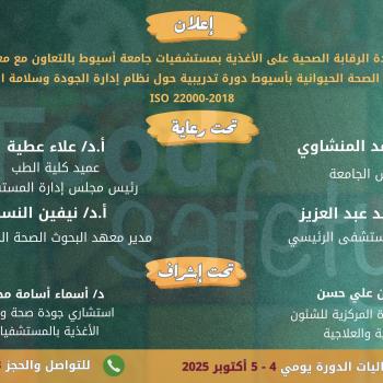 خلال يومي ٤ ـ ٥ أكتوبر ... وحدة الرقابة الصحية على الأغذية بمستشفيات جامعة أسيوط تعقد دورة تدريبية…