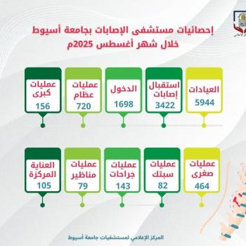 مستشفى الإصابات والطوارئ بجامعة أسيوط يستقبل (9366) متردداً على عياداته خلال أغسطس الماضي المصدر:…