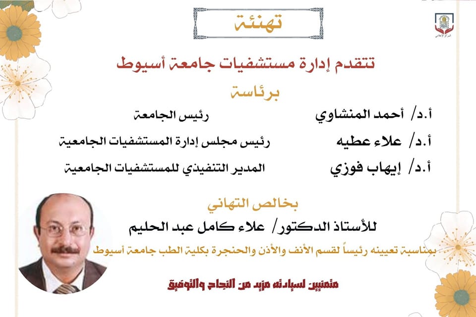 بخالص التهنئة للأستاذ الدكتور / علاء كامل عبد الحليم لتعيين سيادته رئيسا لمجلس قسم جراحة الأنف والأذن والحنجرة - كلية الطب - جامعة أسيوط