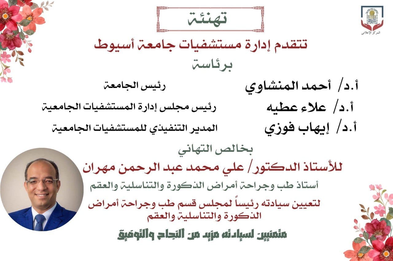 تهنئة 28 ديسمبر 2023 بخالص التهنئة للأستاذ الدكتور / على محمد عبد الرحمن مهران بمناسبة تعيينه رئيساً لمجلس قسم طب وجراحة الذكوره والتناسلية والعقم بكلية الطب - جامعة أسيوط