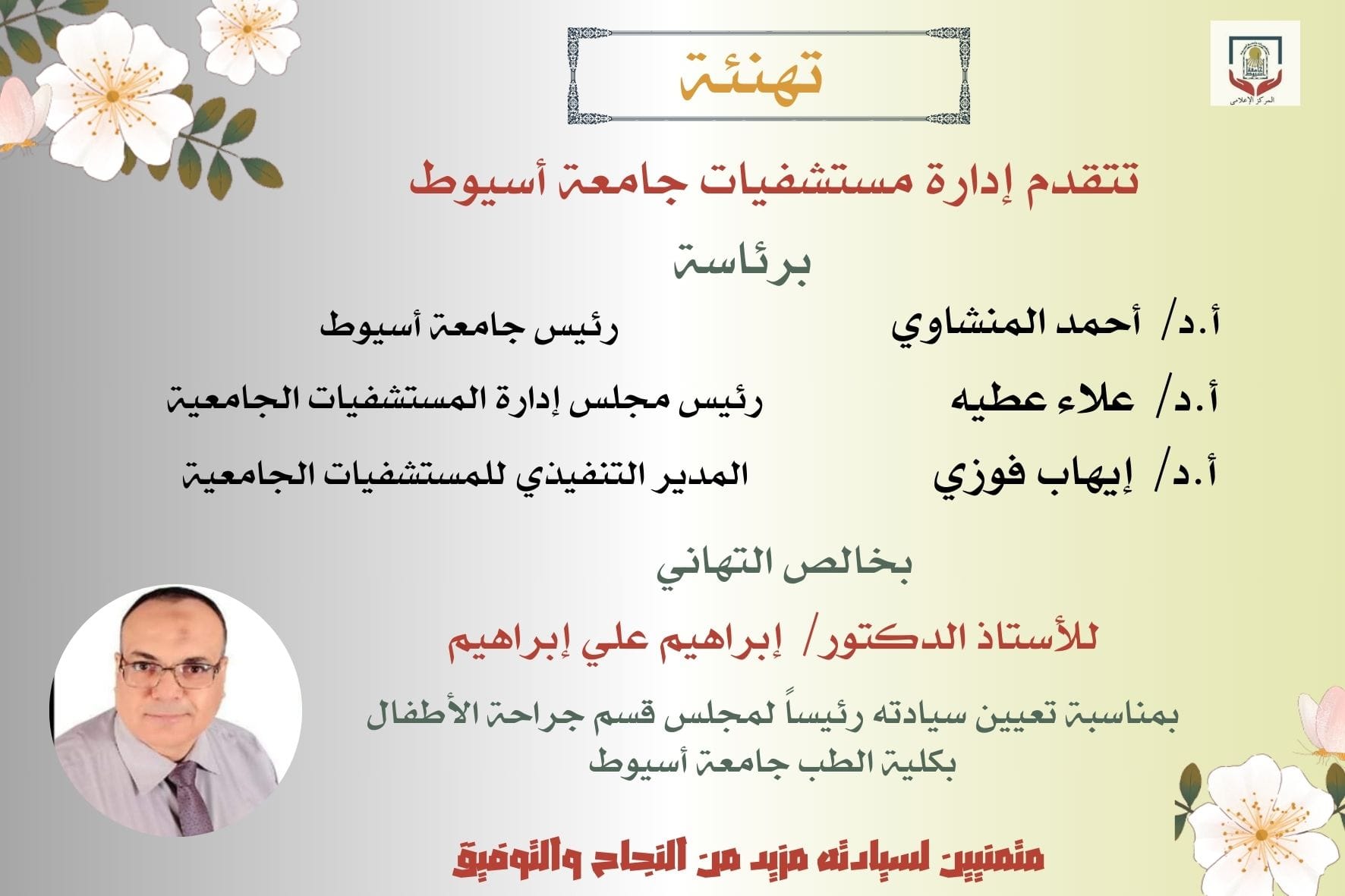 تهنئة 3 يونيو 2024 تهنئة الأستاذ الدكتور / إبراهيم علي إبراهيم - بمناسبة تعيين سيادته رئيساً لمجلس قسم جراحة الأطفال بكلية الطب جامعة أسيوط