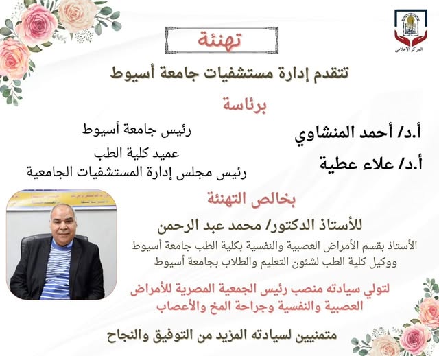 تهنئة 5 يناير 2025 تهنئة الأستاذ الدكتور محمد عبد الرحمن أحمد أستاذ الأمراض العصبية والنفسية ووكيل كلية الطب لشئون التعليم والطلاب لتولي سيادته منصب رئيس الجمعية المصرية للأمراض العصبية والنفسية وجراحة المخ والأعصاب