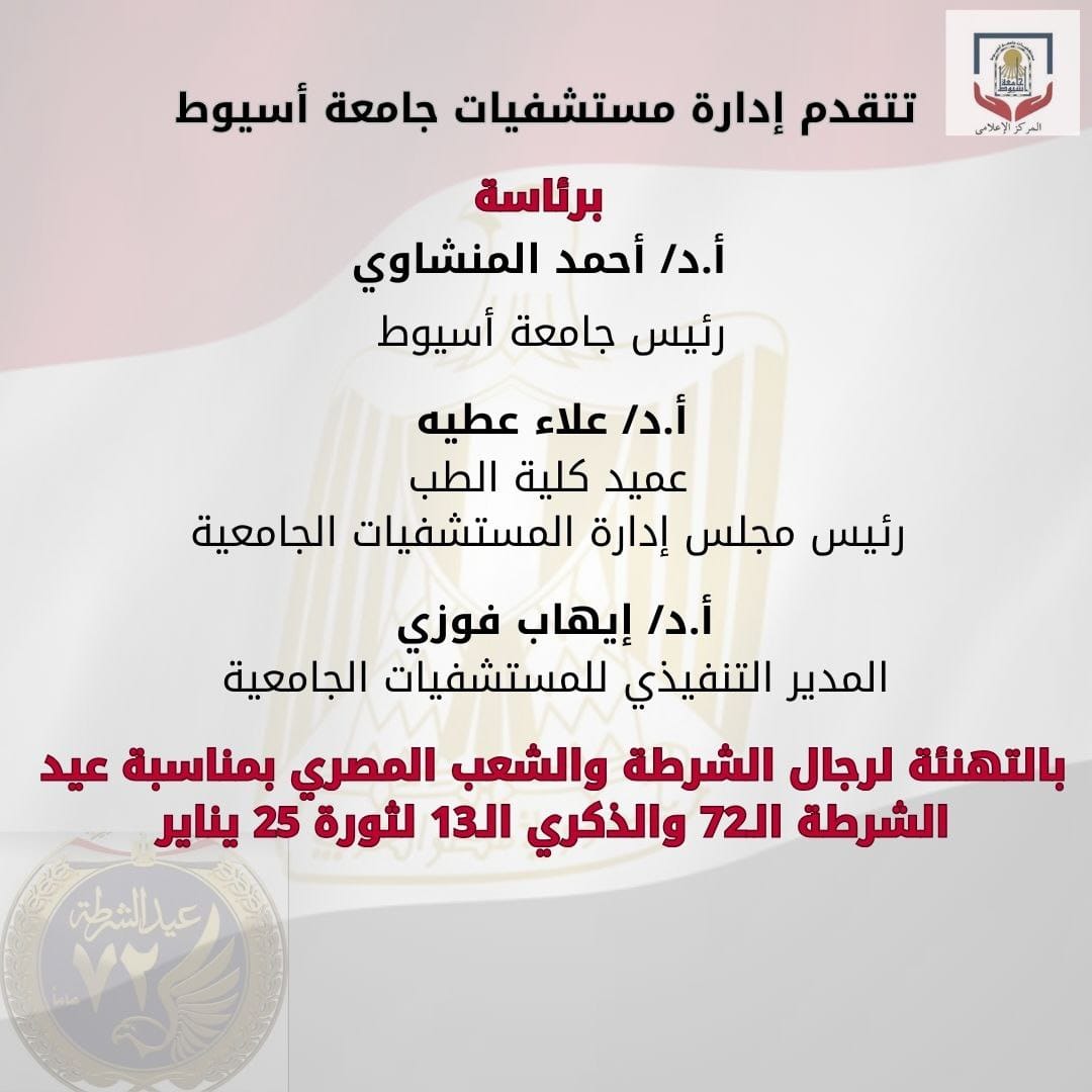 تهنئة بمناسبة عيد الشرطة 21 يناير 2024 تهنئة رجال الشرطة والشعب المصرى بمناسبة عيد الشرطة الــ 72 والذكرى الـ 13 لثورة 25 يناير