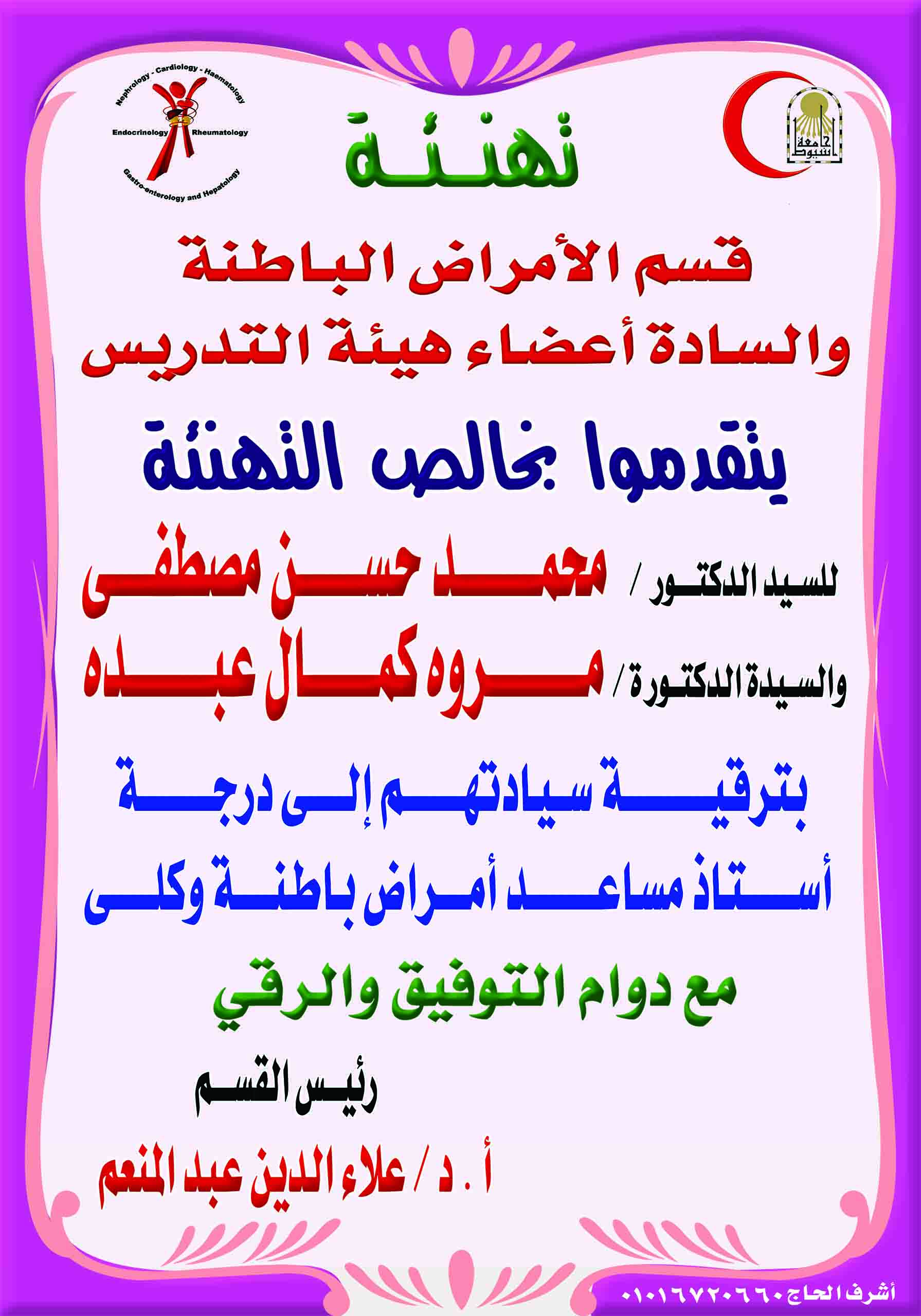 تهنئــــة من أعضاء هيئة التدريس بقسم الأمراض الباطنة إلى دكتور / محمد حسن مصطفى و دكتورة / مروة كمال عبده