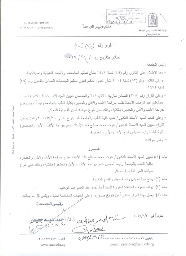 Continue to Appointment of Dr. Ezzat Mohamed Saleh Qayed, the Professor of ENT as as the Department Board Chairman of ENT Department