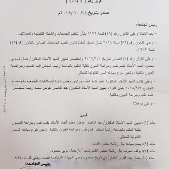 Appointing Prof. Abdel-Naser Awad Mohamed Ahmed, Head of the Ophthalmology Department