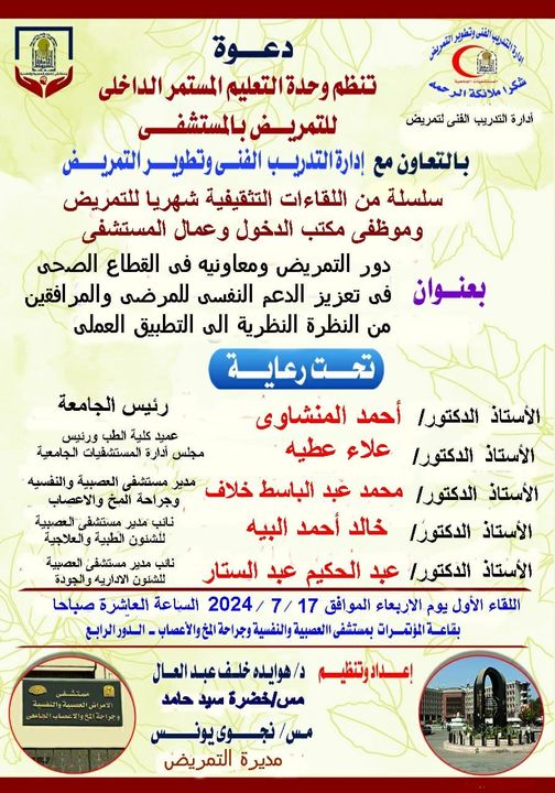 The Nursing Continuing Education Unit at the Neuropsychiatric and Neurosurgery Hospital, in cooperation with the Department of Technical Training and Nursing Development, is organizing an educational meeting on the role of nursing and its assistants in the health sector in enhancing psychological support for patients and companions from theory to practical application, on Wednesday, July 17, under the auspices of Dr. Ahmed Al-Minshawy, President of the University, Dr. Alaa Attia, Dean of the Faculty of Medicine and Chairman of the Board of Directors of University Hospitals, and Dr. Mohamed Abdel Basit Khallaf, Director of the Hospital for Neurological, Psychiatric and Neurosurgery, Dr. Khaled Al-Bayeh, Deputy Director of the Hospital for Medical and Therapeutic Affairs, and Dr. Abdel-Hakim Abdel-Sattar, Deputy Director of the Hospital for Administrative and Quality Affairs.