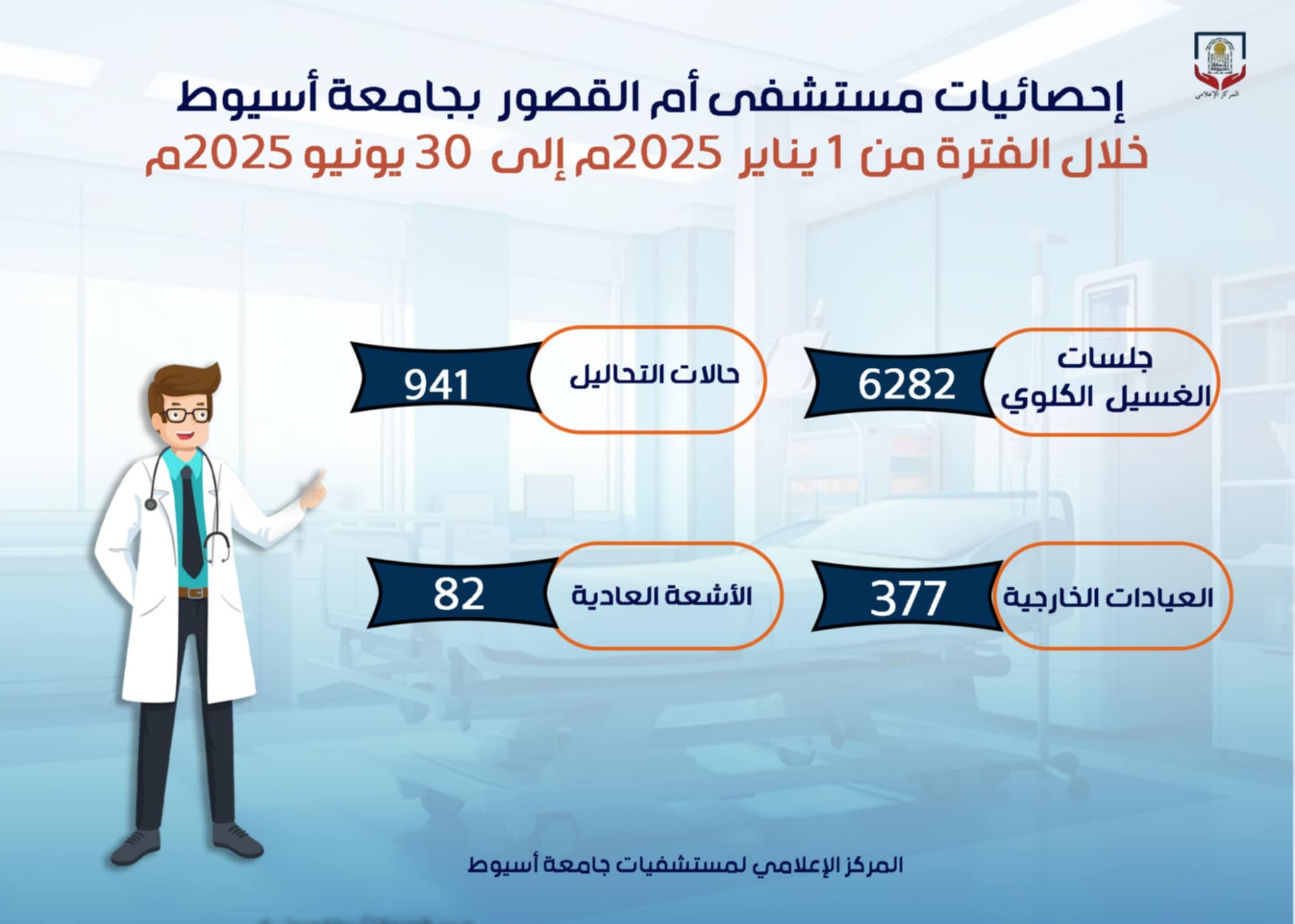 أعلنت مستشفيات جامعة أسيوط برئاسة الأستاذ الدكتور أحمد المنشاوي رئيس الجامعة، والأستاذ الدكتور علاء عطية عميد كلية الطب ورئيس مجلس إدارة المستشفيات الجامعية، عن إجراء مستشفى أم القصور تحت إشراف الأستاذ الدكتور عامر رجب مدير المستشفى، (٦٢٨٢) جلسة غسيل كلوي، خلال الفترة من ١ يناير ٢٠٢٥م إلى ٣٠ يونيو ٢٠٢٥م، وأجرى المستشفى (٩٤١) تحليل، كما سجل المستشفى استقبال (٣٧٧) مترددا بمختلف عياداته، إلى جانب إجراء (٨٢) أشعة عادية، خلال تلك الفترة.